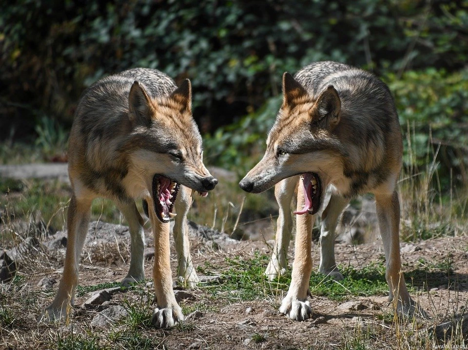 The image shows two coyotes facing each other, with their mouths open as if they are growling or vocalizing. They appear to be in