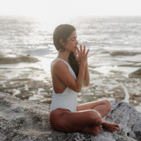 На картинке изображена женщина, занимающаяся йогой на каменистом пляже. Она сидит в медитативной позе, сложив руки вместе, возможно, выполняя асану или упражнение пранаямы. Ее волосы уложены, а в одном ухе видна серьга. Судя по мягкому освещению и спокойной атмосфере, время близится к закату. На заднем плане изображен океан, что указывает на спокойную обстановку для ее практики.