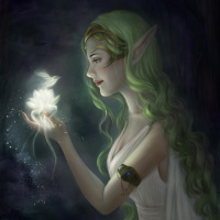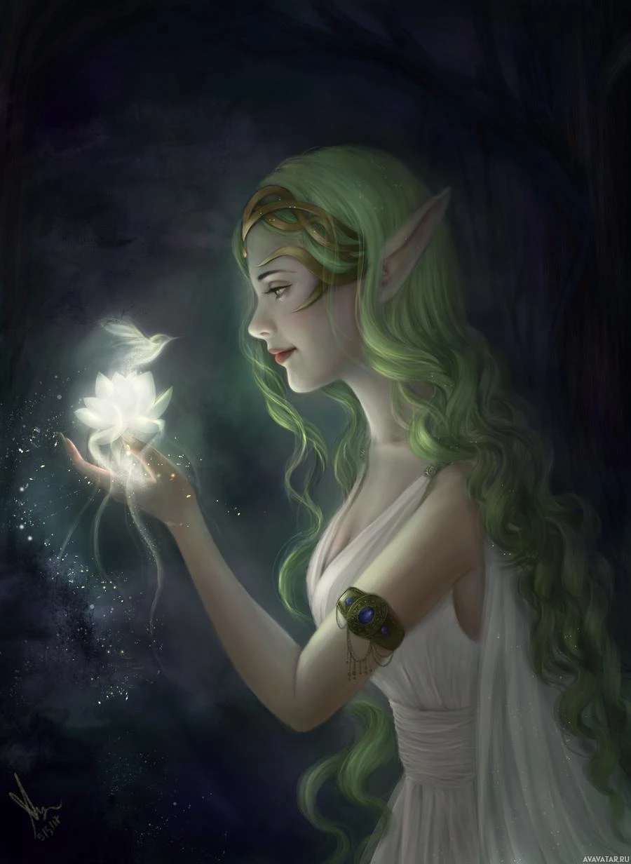 a nighttime setting, possibly enhanced by the presence of small sparkling elements around her. The overall atmosphere of the image is one of enchantment and mysticism, fitting within the fantasy theme.