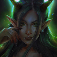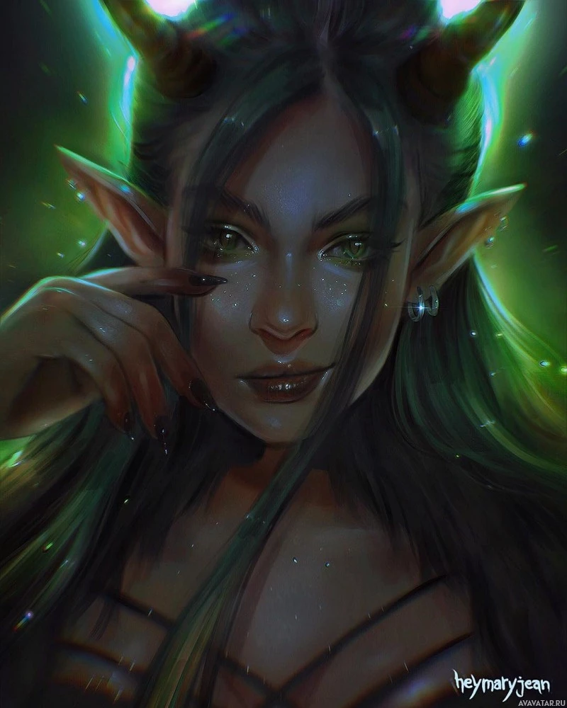 green eyes and is adorned with what seems to be horns on her head, adding to the mystical or demonic aesthetic of the artwork. The character has