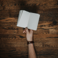 На картинке изображена рука человека, держащая открытую записную книжку или журнал. Основное внимание на снимке уделяется рукам и записной книжке, на заднем плане мало деталей.