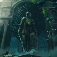 a fantasy scene with a sword-wielding figure standing in the foreground, facing towards an imposing castle or ruins that appear to be shrouded in mist. There is a statue of
