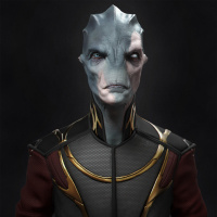 breathing apparatus on its neck. The alien is wearing a red and gold suit, suggesting it might have a role in