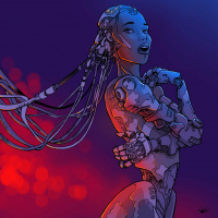 cybernetic enhancements, resembling robot parts or mechanical components. She is set against a backdrop that seems to represent a dark, space-like environment with glowing