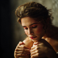 a subtle touch of glitter on her hair and cheeks, which adds an ethereal or magical quality to her appearance. The woman is wearing what seems to be a vintage-inspired outfit with a dress that has a cinched waist, reminiscent of styles from the early