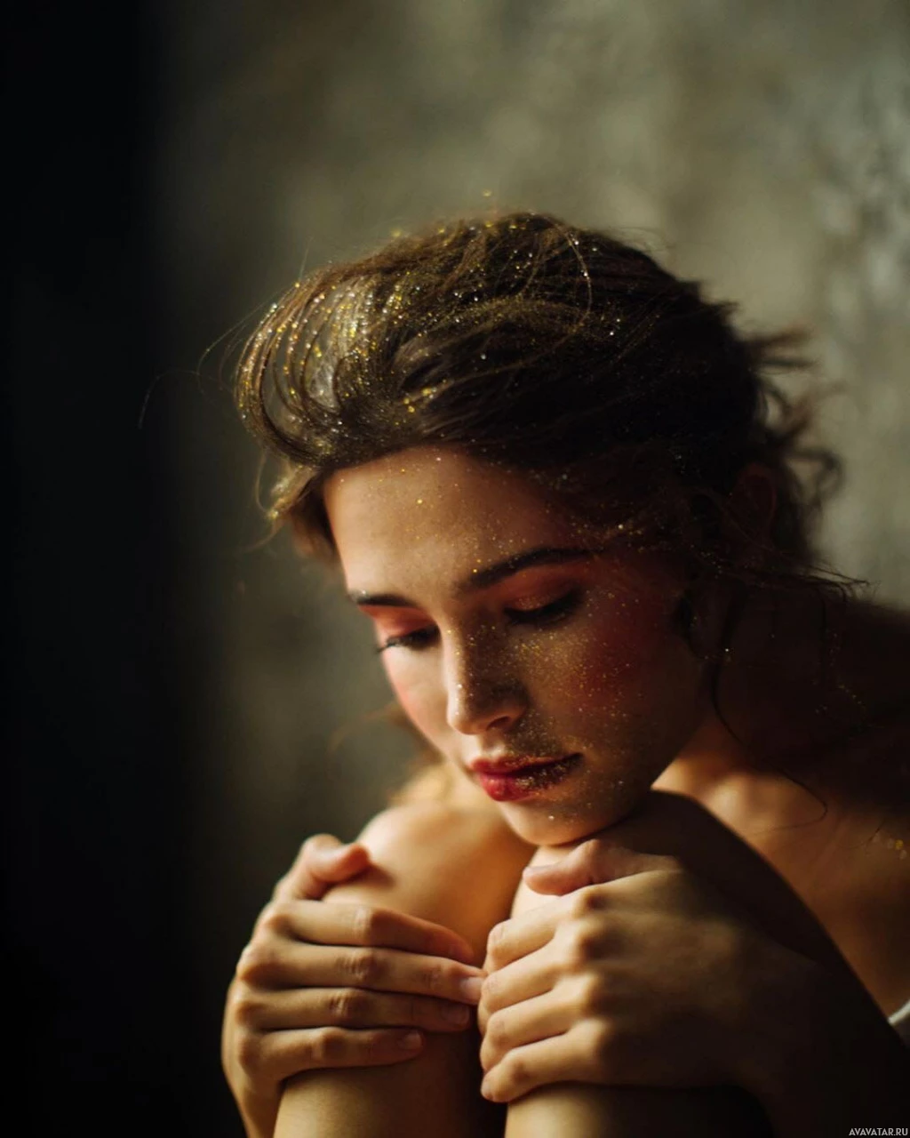 a soft light that casts gentle shadows on her face and the wall behind her. There's