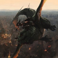 a fantasy scene featuring a dragon and human figures. The dragon is large, with a prominent
