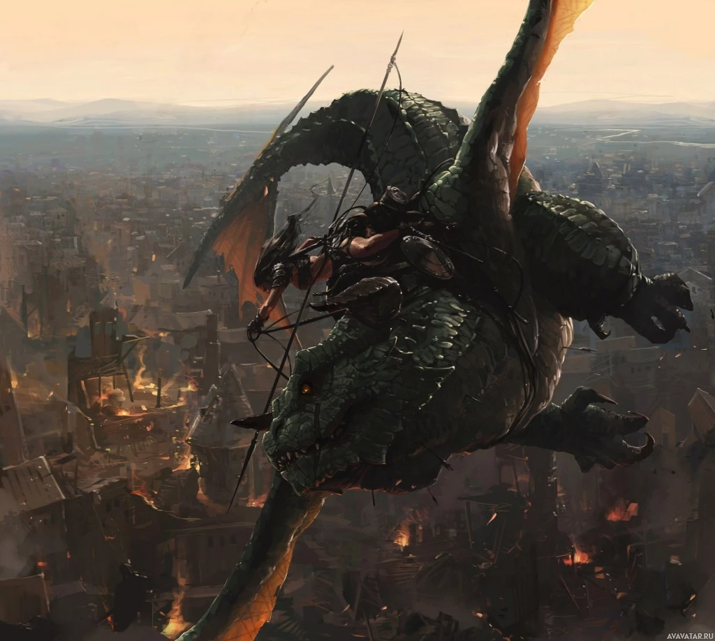 the back of the dragon, likely serving as a warrior or adventurer. There are also other individuals scattered around the scene, some of whom are armed with bows and spears, indicating conflict or combat. The overall atmosphere of the image is dramatic and intense, fitting within