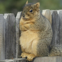 a wooden fence. The squirrel appears to be sitting upright and has its paws clasped together in front of it, almost as if it's hugging itself. It seems to be looking at something or someone with interest.