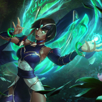 an animated character that appears to be a young female with dark hair. She is dressed in what seems to be fantasy-style attire, including armor and holding a staff or wand. Her expression is focused and determined as she faces forward. Behind her are lush green plants, suggesting a forest or jungle setting, which fits