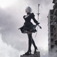 The image shows a character from the video game "Nier: Automata." This is cosplay, which involves dressing up as a character from a film or series, typically for recreational purposes. The character is standing on broken pillars and debris in an apocalyptic setting with ruins around, suggesting a post-apocalyptic scenario.