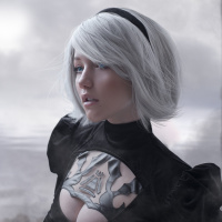 blonde hair and wears a black outfit with mechanical details, which is consistent with her appearance in the game.