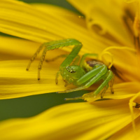 The picture shows a small green spider perched on the yellow petals of a flower. There are no animals or flowers in this image, and there is no mention of spiders either.