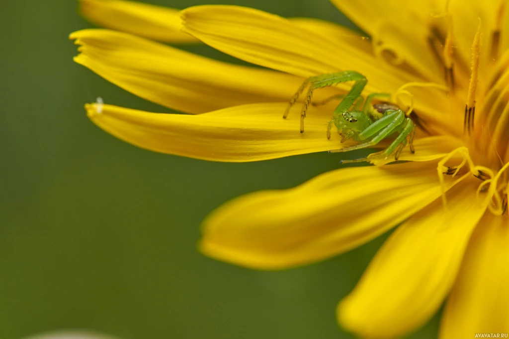 На картинке изображен маленький зеленый паучок, сидящий на желтых лепестках цветка. На этом изображении нет животных или цветов, и нет упоминания о пауках.