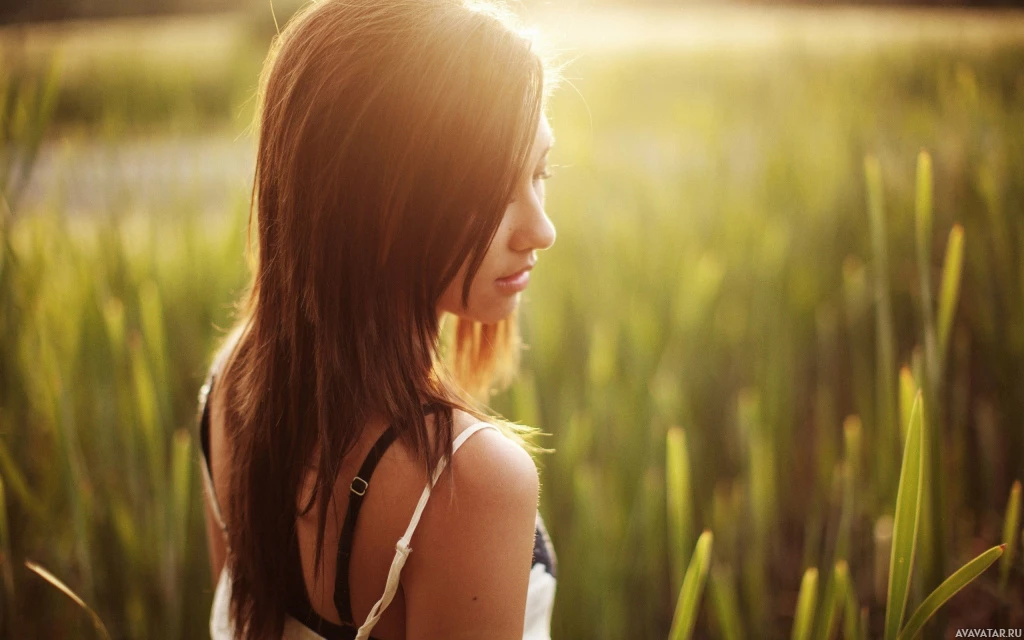 a young woman standing in a field during what appears to be either sunrise or sunset, given the warm glow of the light. She is looking towards the side and away from the viewer, her face obscured by the angle and distance of the shot. Her hair is styled straight, and she is wearing