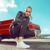casual attire, including sneakers and a jacket, and has a confident posture. There's a clear blue sky in the background, suggesting