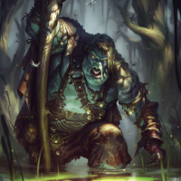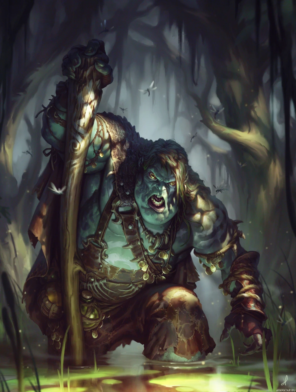 nature of the character. The surrounding environment includes misty trees that give the impression of being in a haunted swamp or