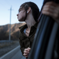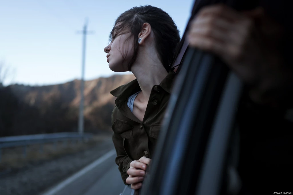 a young woman with brown hair, looking out of the window of a car. She appears to be gazing off into the distance, possibly enjoying the view or lost in thought. The car is stopped on what looks like a roadway, and there are trees and a fence visible in the background. The overall tone of the image suggests it could be from a film or a photograph capturing a moment during travel.