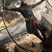 ships in the water; one appears to be on fire or damaged, with smoke rising from it, suggesting conflict. A character dressed as a pirate is shown holding onto a ship railing, looking over his shoulder towards the other ship, which might indicate that he is either preparing to board