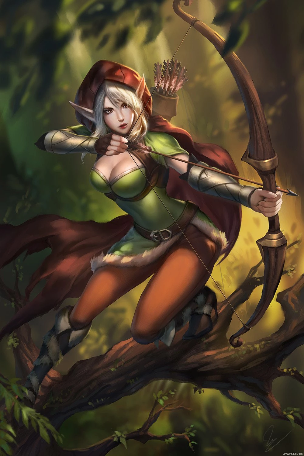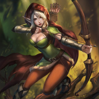 a green hood that matches the color of her archery bow. The character has