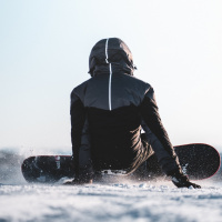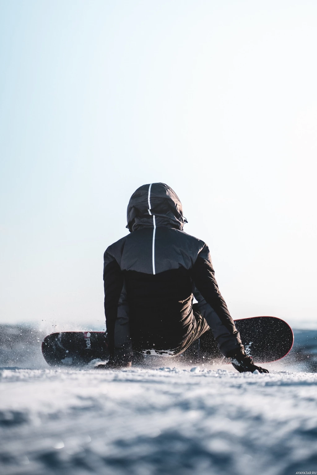 The image shows a person sitting on the snow with a snowboard attached to their feet. They are looking out towards the horizon, which appears to be clear and bright. The setting suggests that it is during winter, likely at