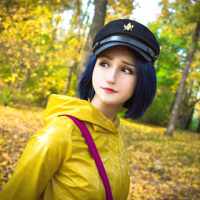 На картинке вы видите молодую женщину, одетую в наряд, напоминающий персонажа Эда из анимационного фильма "Твоя ложь в апреле". На ней синий парик и черная кепка, а также желтый дождевик. Обстановка кажется осенней, вокруг нее опавшие листья. На ее лице задумчивое выражение, она смотрит в сторону от камеры, на лес на заднем плане.
