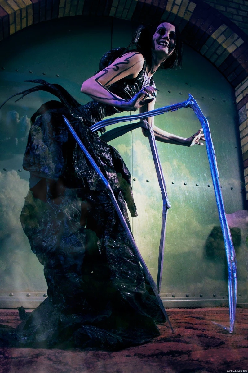 dark clothing, large spider-like limbs protruding from their back, and face paint that accentuates a gothic or demonic appearance. This cosplay could be inspired by various sources such as movies, books, or other media where