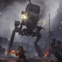 a dramatic scene of a large, mechanical walker-type vehicle in what appears to be an urban war zone. There are characters on the ground, some seeming to attack or confront the robot, and one character holding
