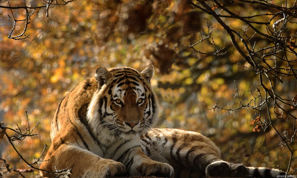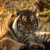 natural habitat, surrounded by green foliage that suggests it might be during autumn or a season with changing leaves. The tiger is sitting upright on what looks like the edge of