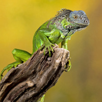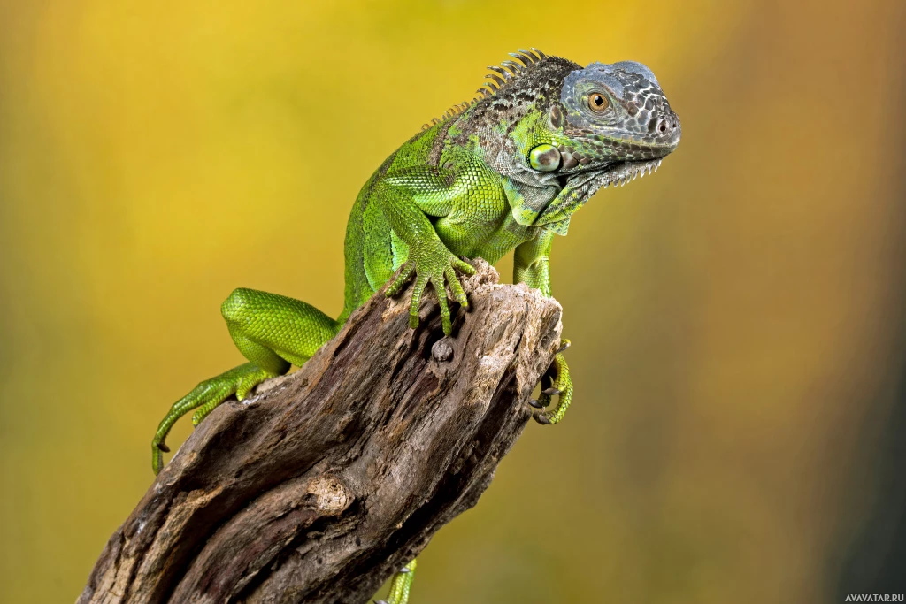 На картинке изображена игуана, сидящая на ветке дерева. У игуаны разноцветное тело с оттенками зеленого и желтого. Кажется, что она наблюдает за окружающим миром или смотрит прямо в камеру. На заднем плане видны намеки на окружающую среду, что позволяет предположить, что этот снимок мог быть сделан в естественной среде обитания, где обитают игуаны.