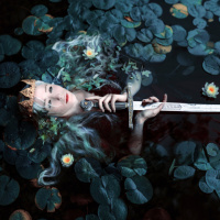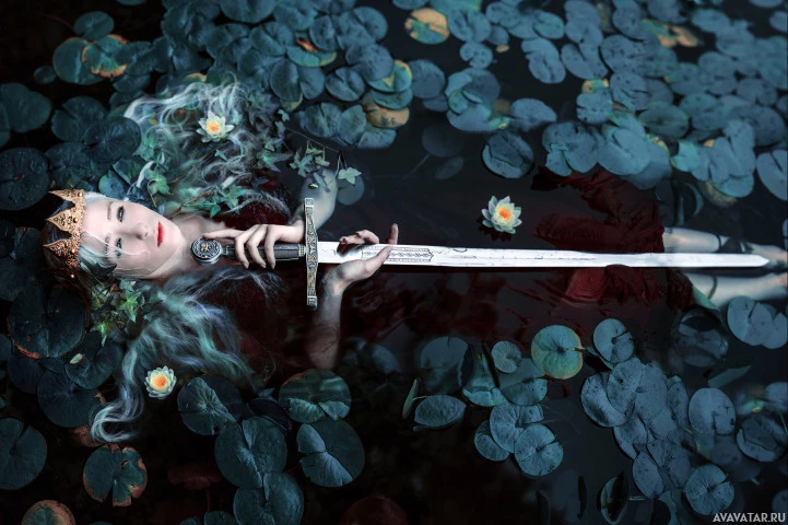 На картинке изображена молодая женщина, лежащая в воде среди листьев кувшинок. На голове у нее что-то похожее на корону или тиару, а в руках она держит меч. Судя по освещению, сейчас раннее утро или поздний вечер, и атмосфера безмятежная. Девушка, кажется, изображает персонажа из фантастической литературы или художественного произведения.