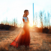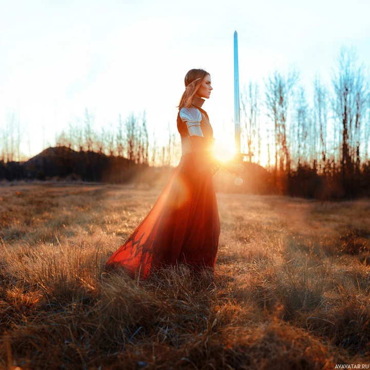 a long dress and holding a sword upright in front of her body. The setting seems to be outdoors during sunset or twilight, as the lighting is warm with the glow of