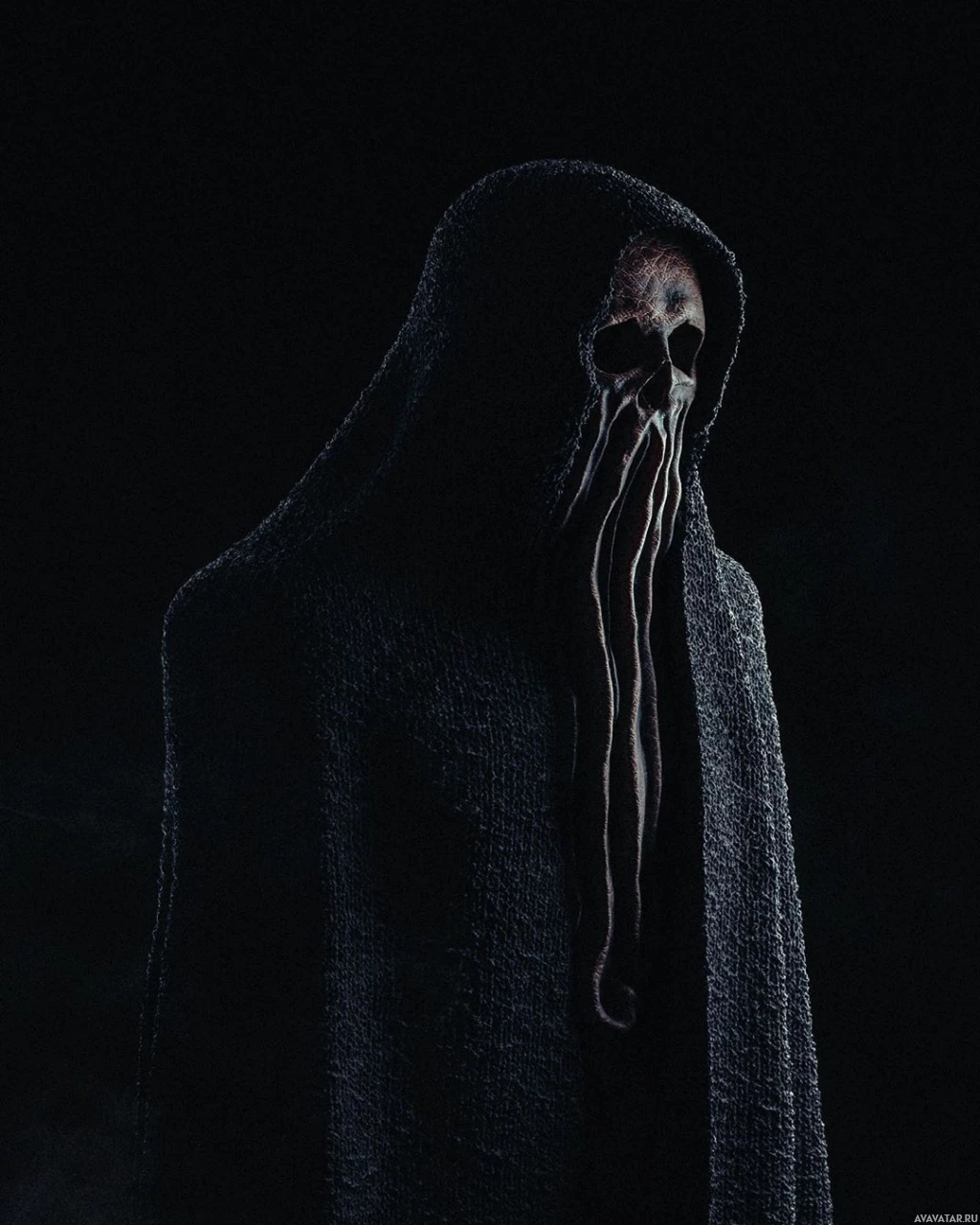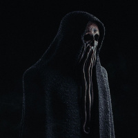 dark attire with a hood that obscures their face. They appear to be wearing some form of mask or makeup, giving them