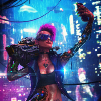 cityscape at night with digital interfaces overlaying the environment, which is indicative of the cyberpunk genre. This character might be associated with the Cyberpunk 2077 game or similar themed media.