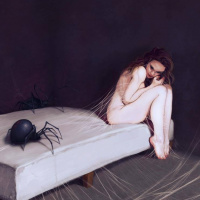 spider webs like a dress and has her legs wrapped in the same webs. There are two large black spiders on the bed, one on each side of her. The room appears dark, with a dimly
