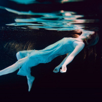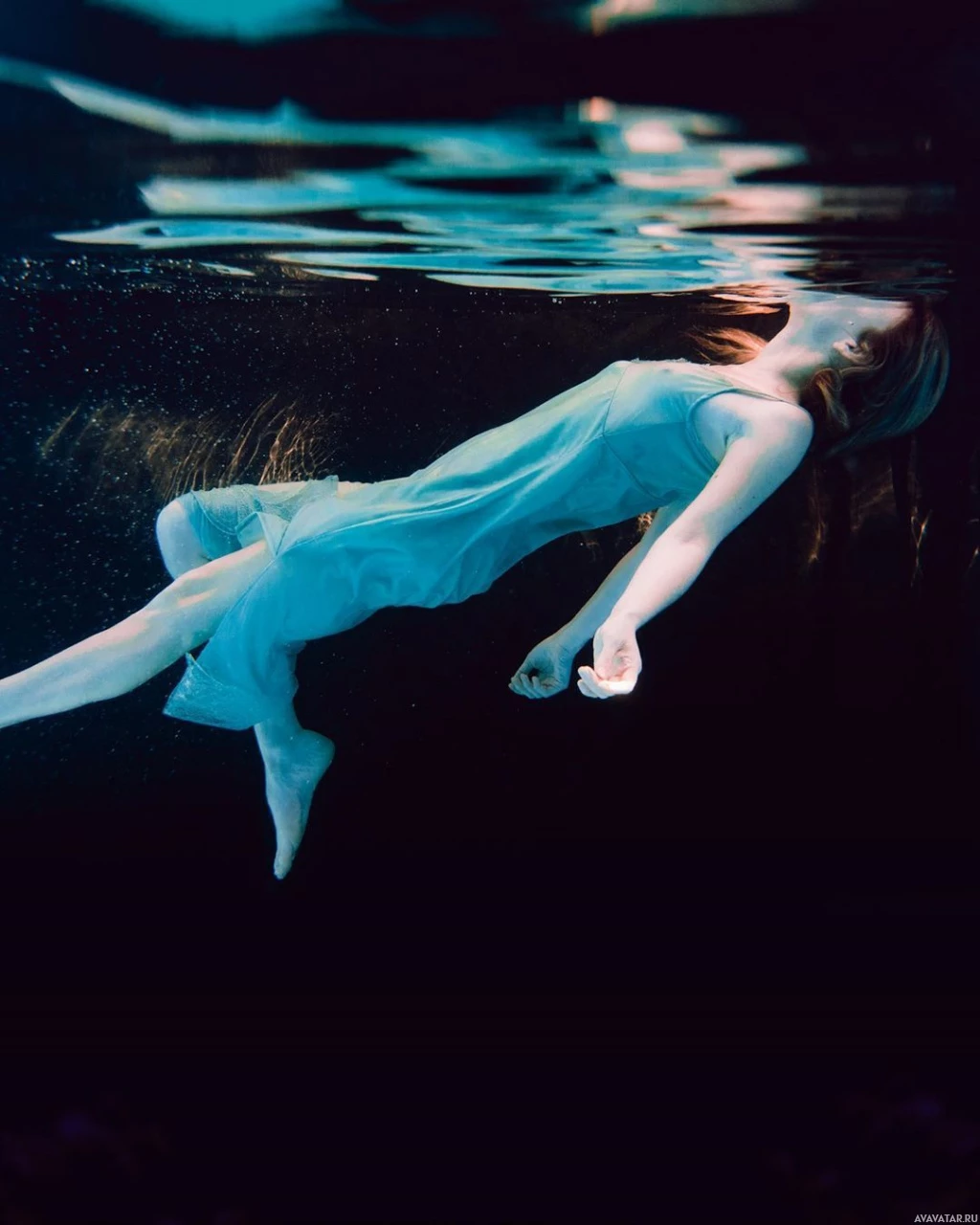 The image shows a person submerged in water, possibly