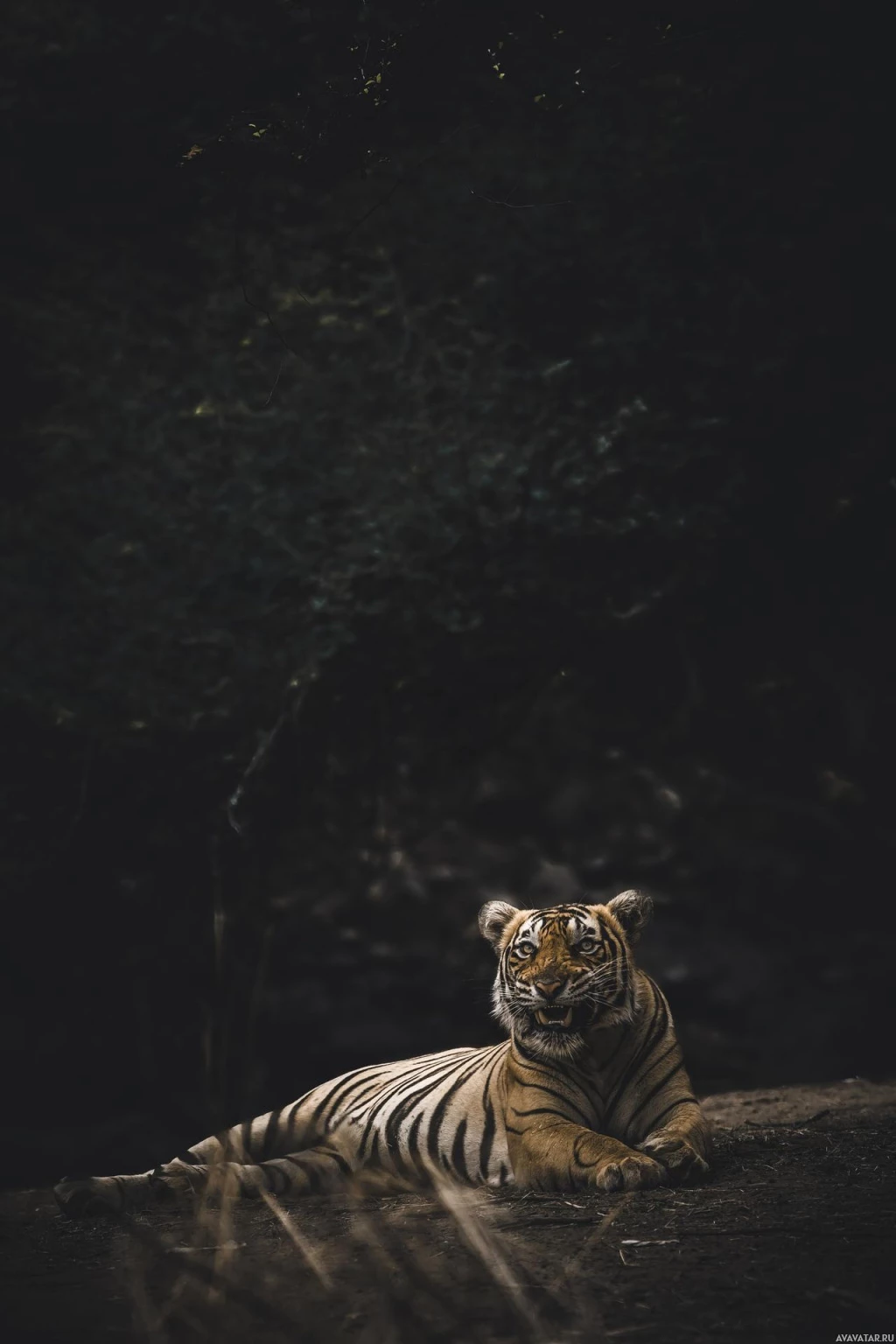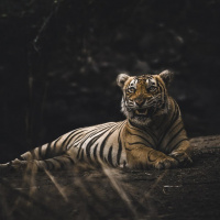 dark environment, possibly within a forest or near a water source given the reflection of light in the background. The tiger's gaze is directed towards the camera, and it seems to be displaying an alert or