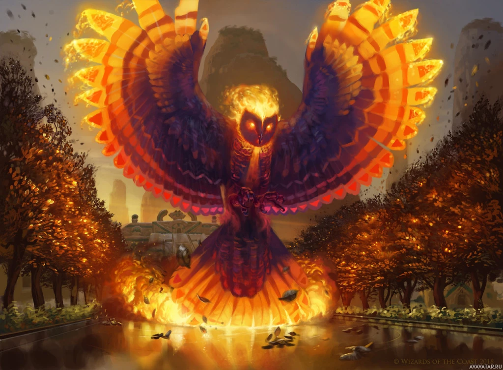 a fantastical scene featuring an owl-like creature with large wings spread wide, standing on what appears to be flames. This creature is anthropomorphized, giving it human-like features such as arms and legs, as well as clothing that resembles traditional tribal or folk attire. The background suggests a village scene during autumn, with trees bearing