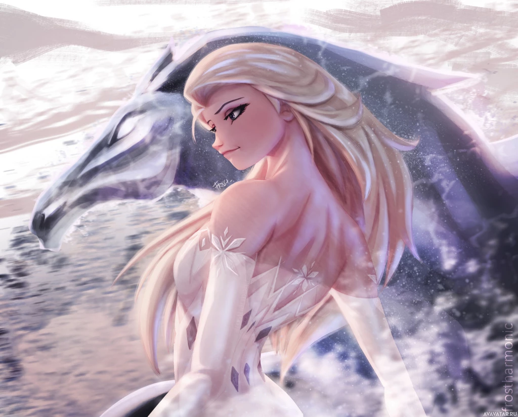 На картинке изображена анимационная героиня Эльза из фильма "Холодное сердце", скачущая верхом на лошади. Кажется, что место действия находится рядом с водоемом, так как на заднем плане видны волны. У героини распущенные волосы и выражение лица расслабленное и довольное.