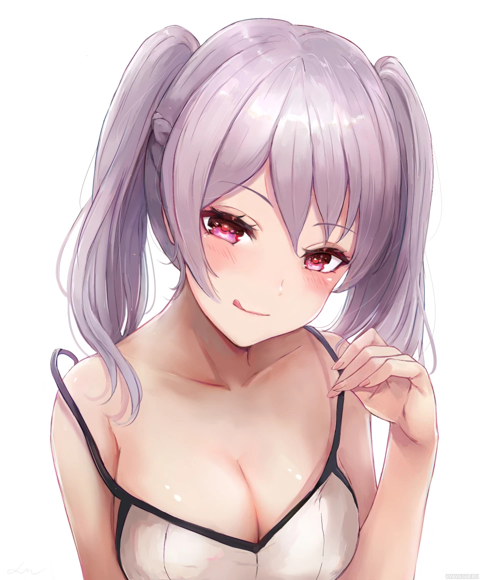 purple hair, wearing what appears to be a tank top or a white top with some black elements. She has