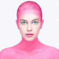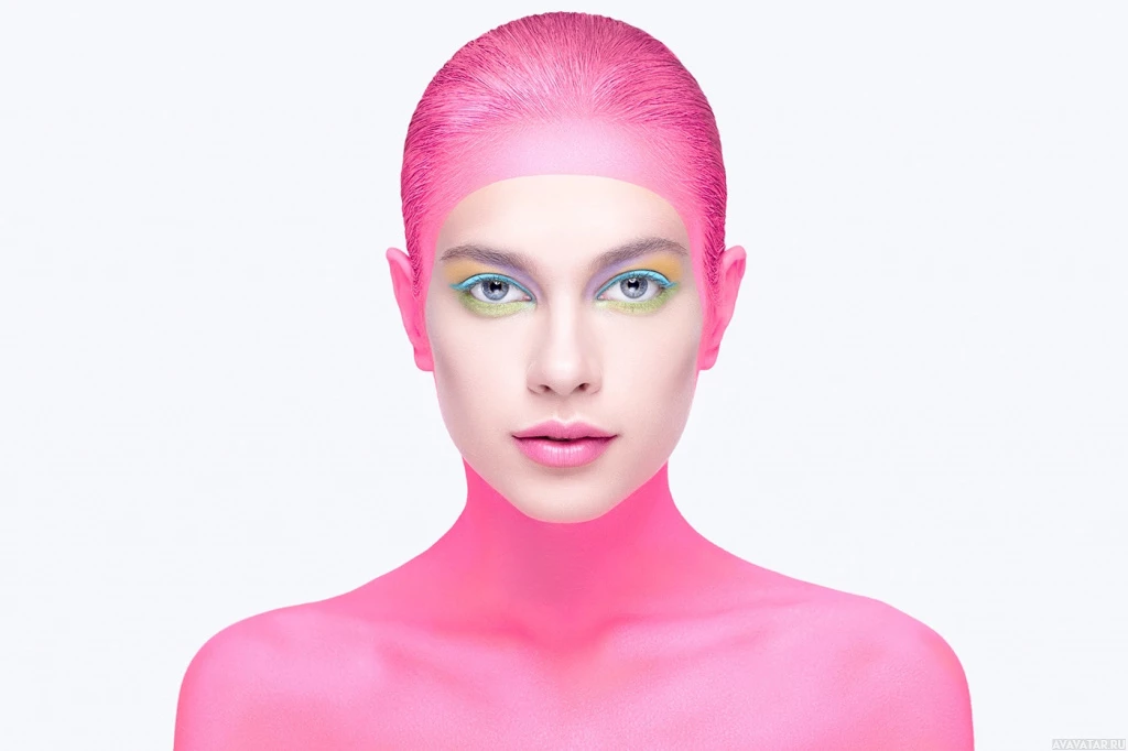 pink hair, who appears to be wearing makeup with a combination of bold colors including blue eyeshadow and green highlights around the eyes. They are looking directly at the camera and seem to have