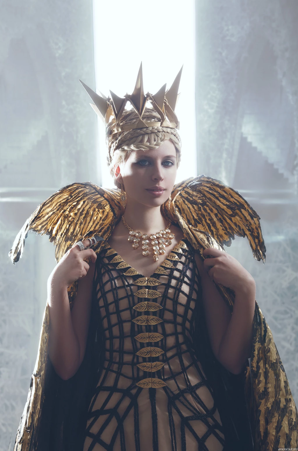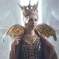 The image shows a woman dressed in elaborate and ornate attire that resembles historical or fantasy-inspired clothing, often associated with the term "crowns" which refers to headwear. She is wearing a crown on her head and has wings attached to her back, which are also part of the costume. The woman appears to be gazing slightly upwards and off to the side, and she has