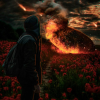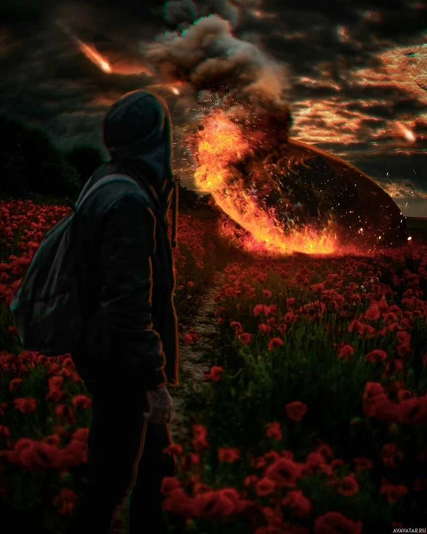 red flowers, possibly poppies. In the background, there is an explosion or fire with smoke and embers visible, suggesting some