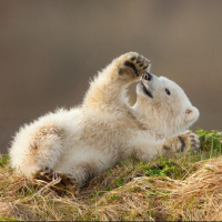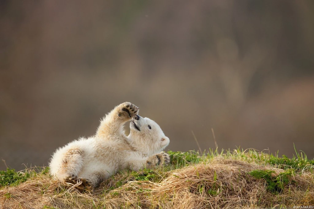 a bear cub, while the other is a puppy. They seem to be engaging with each other, possibly playing or interacting in