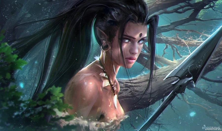 popular culture. She has long black hair, pointed ears characteristic of an elf's appearance, and her eyes glow blue, which could indicate magical abilities or special status within