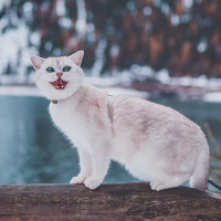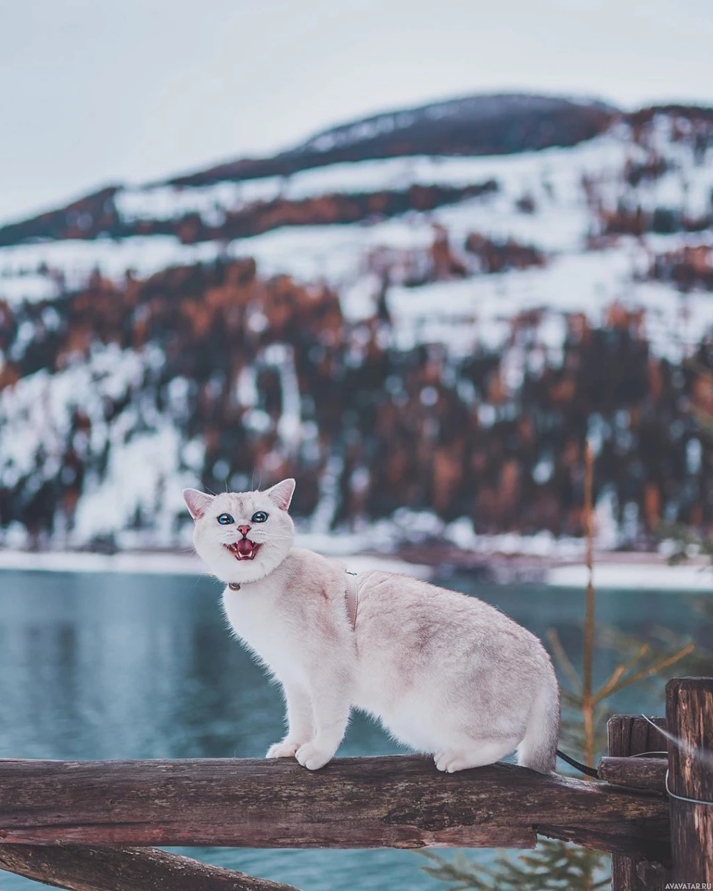 На картинке изображена кошка, сидящая на деревянном заборе возле водоема, который, по-видимому, является озером или рекой. Окружающий пейзаж включает заснеженные горы на заднем плане и деревья, растущие вдоль берега. Небо затянуто облаками, прямых солнечных лучей не видно.