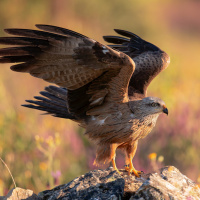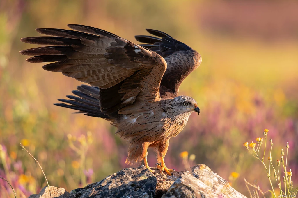 a golden eagle due to its size and the coloring on its wings. It has its wings spread wide, which could indicate that it is in motion or preparing to fly. There are also flowers visible in the foreground of the image.