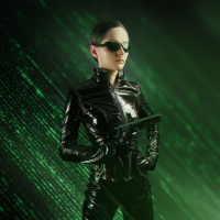digital effects that mimic the visual style of the "Matrix" films, with what appears to be digital rain or code elements. This is likely a cosplay image taken by someone who enjoys dressing up as