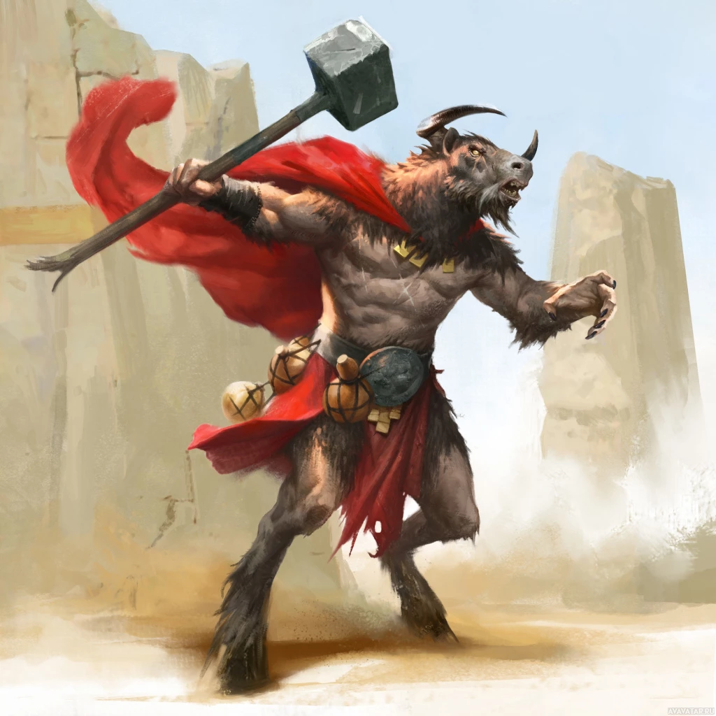 the body of a human with the head and possibly other parts of a bull. This creature is holding a hammer over its shoulder, suggesting it might be a warrior or guardian. The minotaur is also wearing