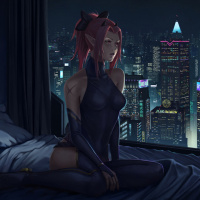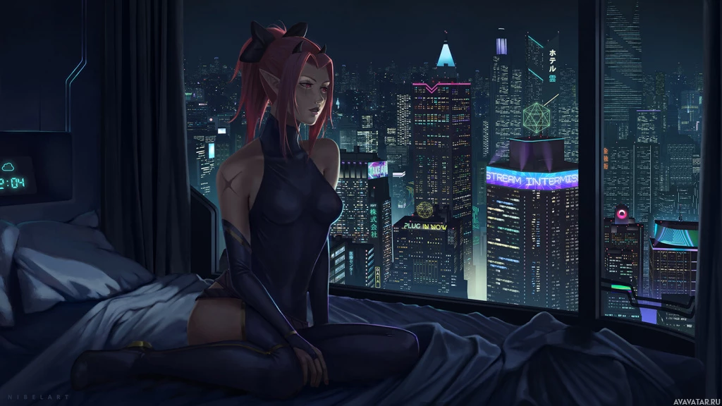 illustrated character who appears to be a fantasy-themed elf with cat ears, sitting on a bed at night. She is looking out of a window that overlooks a futuristic cityscape filled with